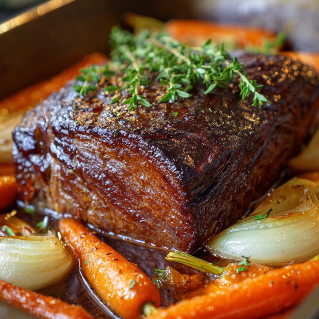 Ein köstlicher Rinderbraten, der im Ofen zubereitet wird und perfekt zart und saftig ist.